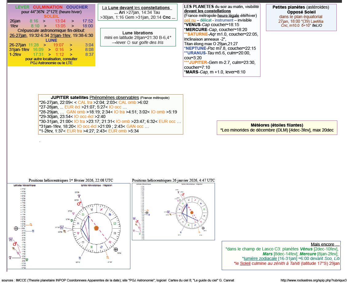 Ciel du mois ; Phénomènes astronomiques ; Visibilité de la Lune et des planètes ; Cartes du ciel