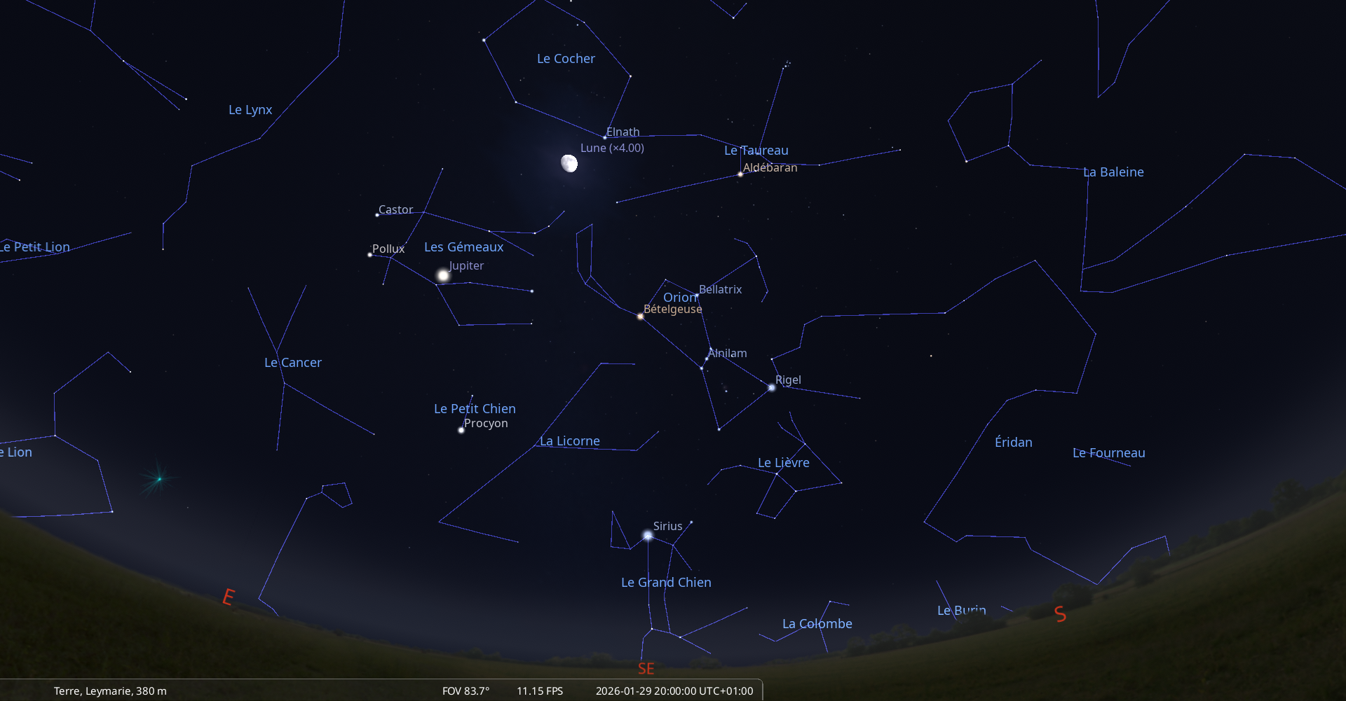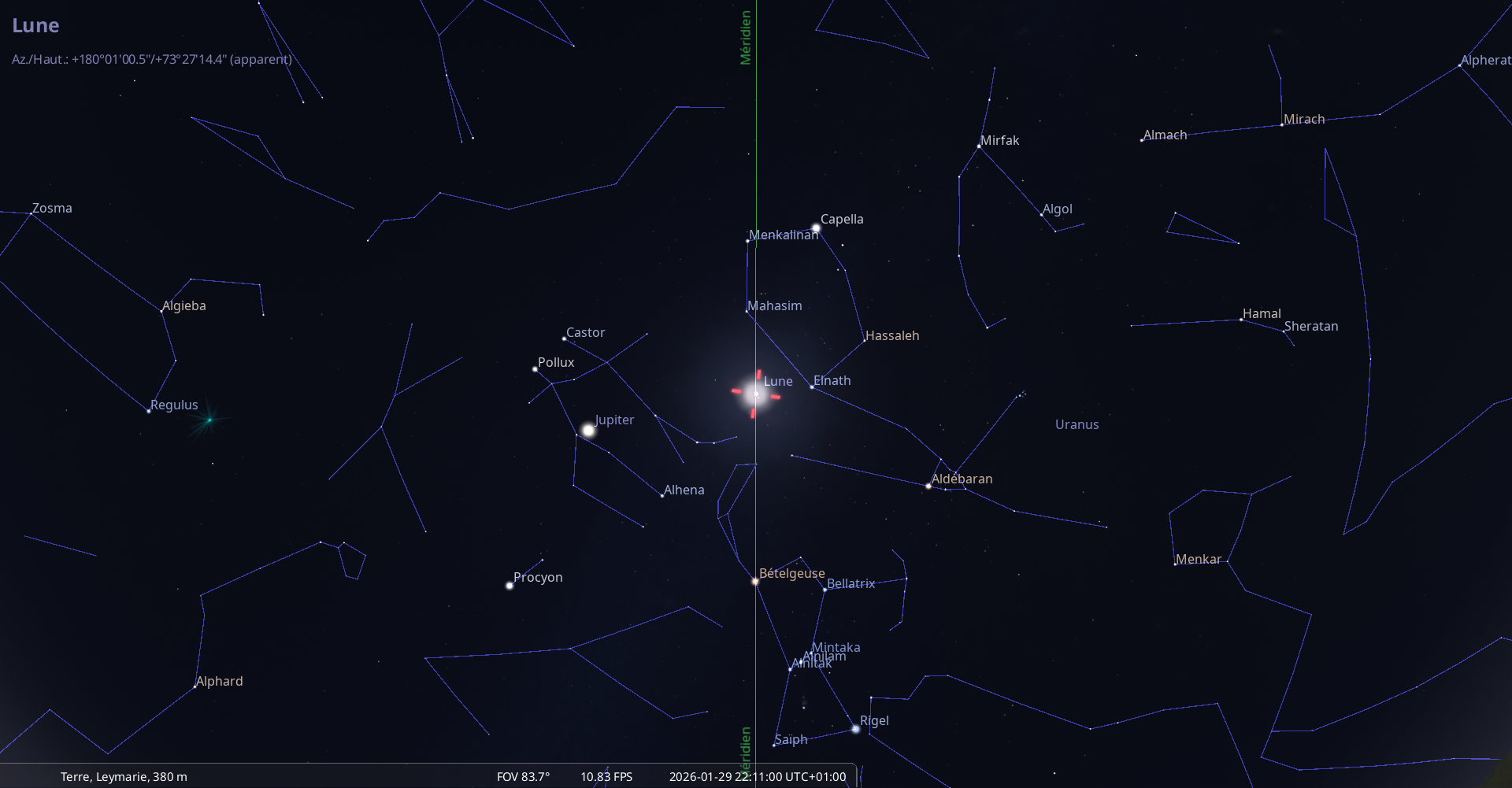 La nuit du 29 au 30 janvier, pour notre localisation, Elnath culmine à 21h43, la Lune à 22h11