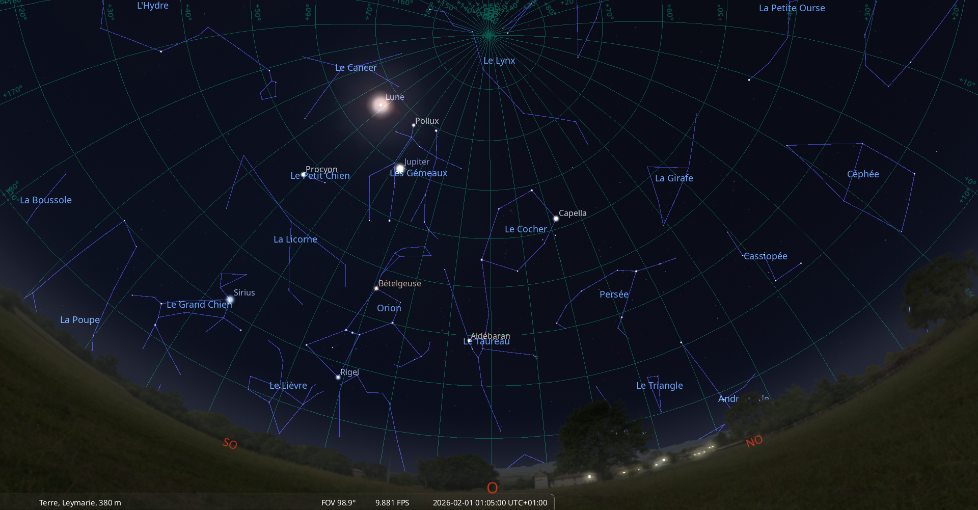 - A 1h16, la Lune arrive devant la constellation des Gémeaux (Gem) ; longitude 91°03’ (2e CAN) ; latitude +4°50’, descend