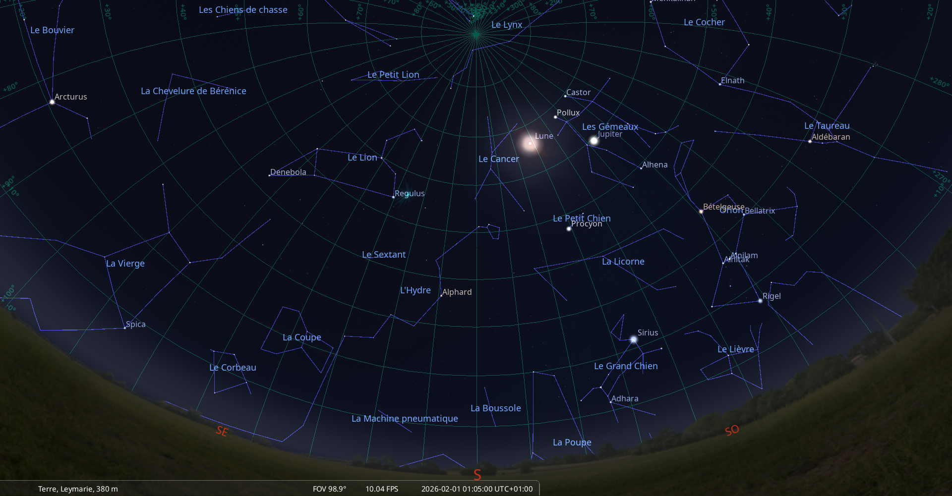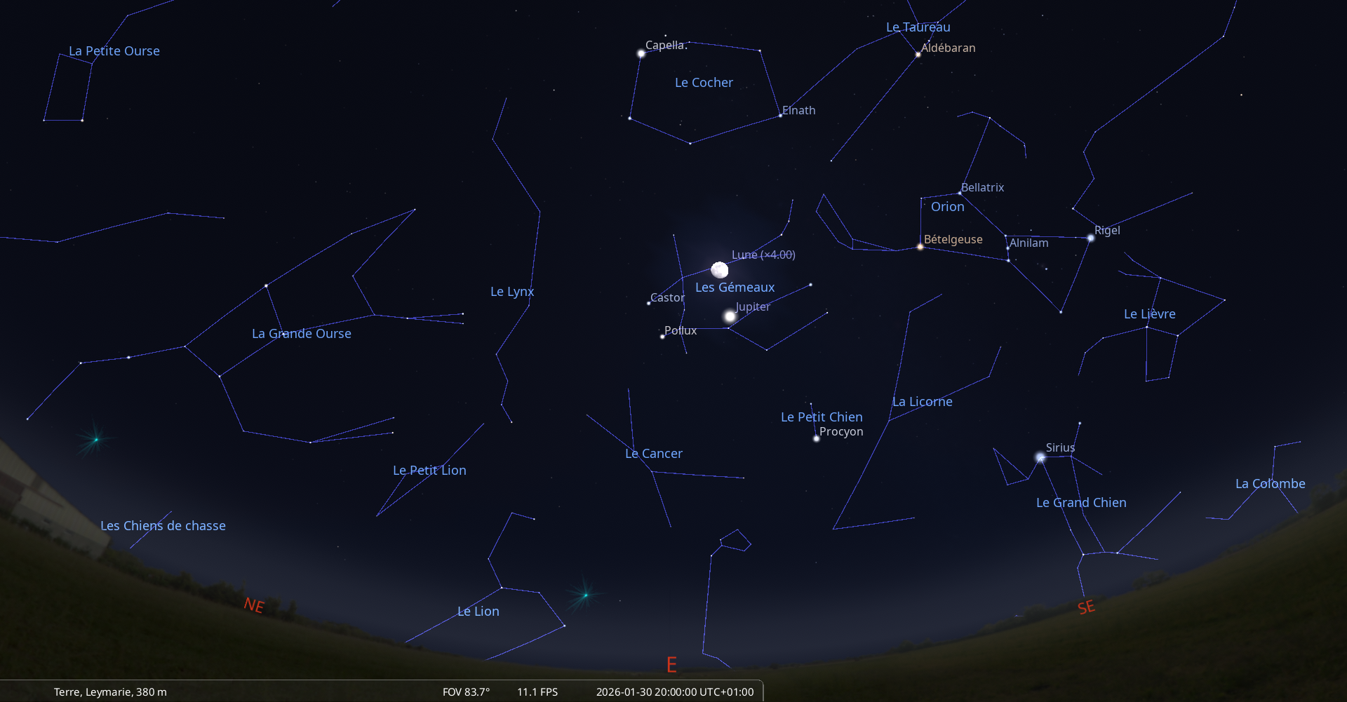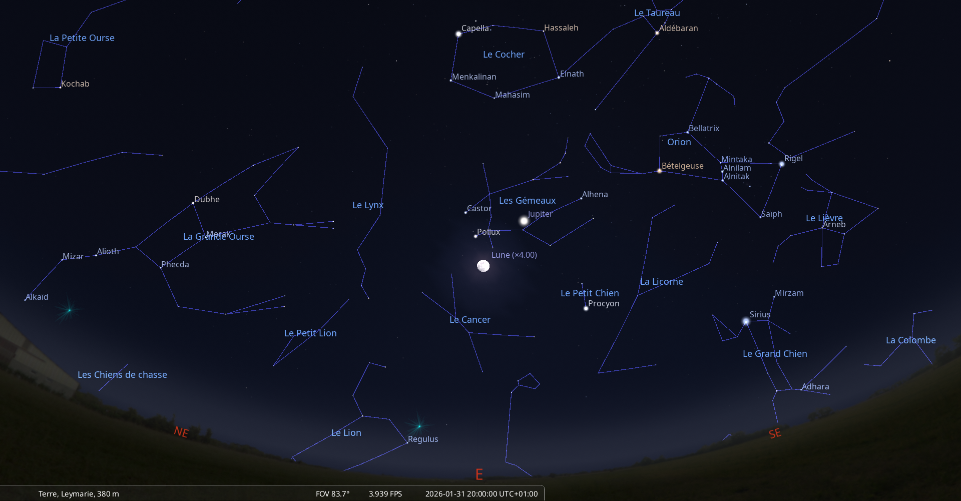 La nuit du 30 au 31 janvier, pour notre localisation, la Lune culmine à 23h15, Jupiter à 23h26 ;