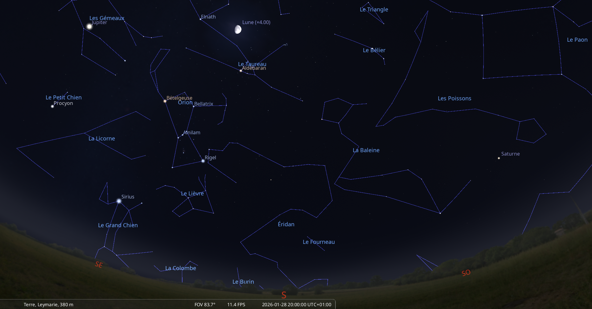 Dans la nuit du 27 au 28 janvier, pour notre localisation, la Lune culmine à 20h05, les Pléiades à 20h11,