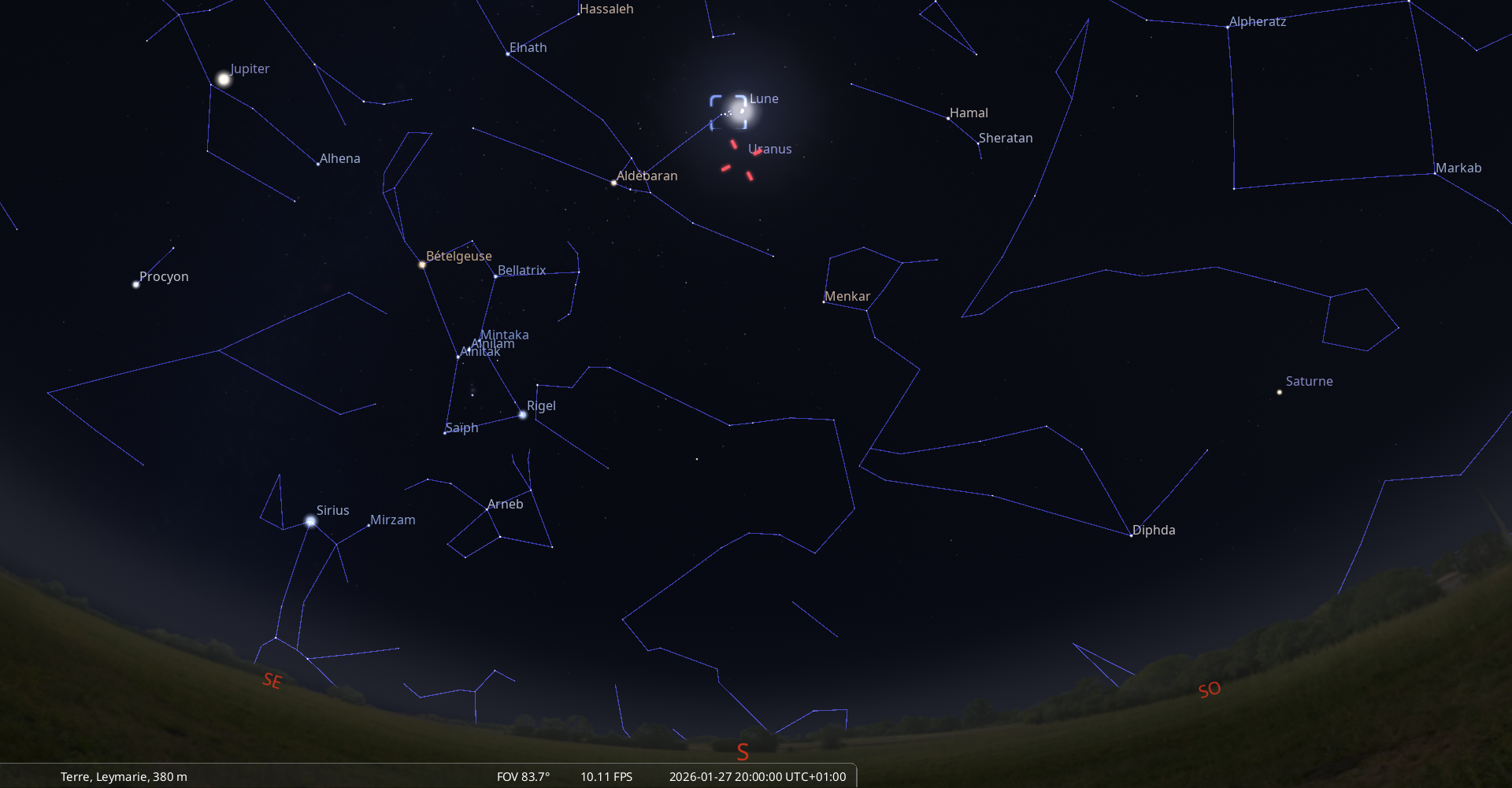 Le 27 janvier au soir, pour notre localisation, Uranus culmine à 20h04, la Lune à 20h05.