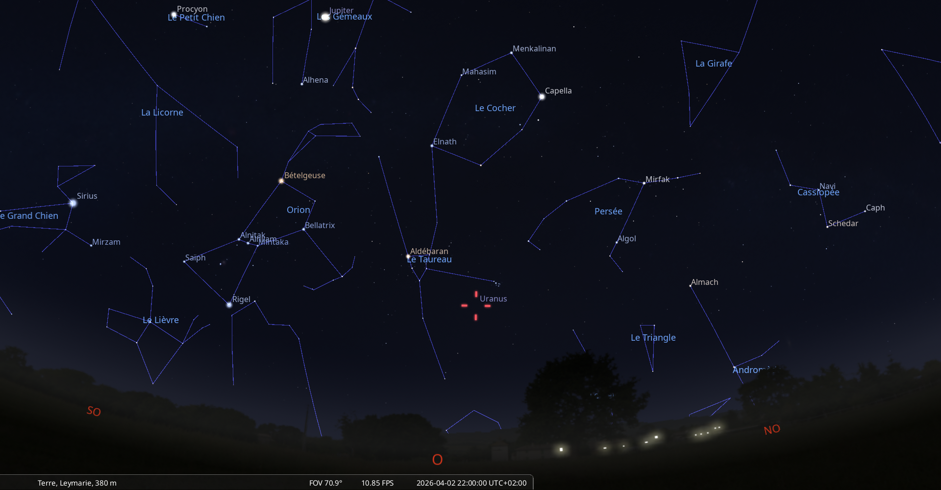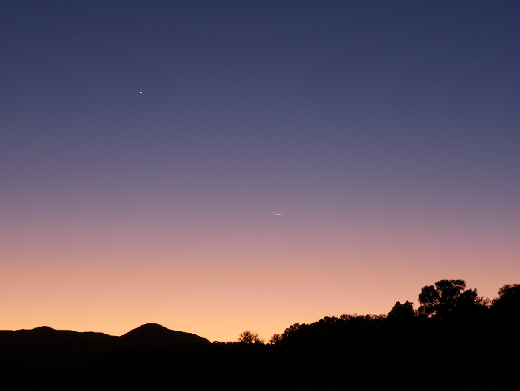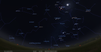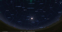 à l’Est-sud-est à une cinquantaine de degrés de hauteur, à moins de 5° à droite du croissant de Lune.
