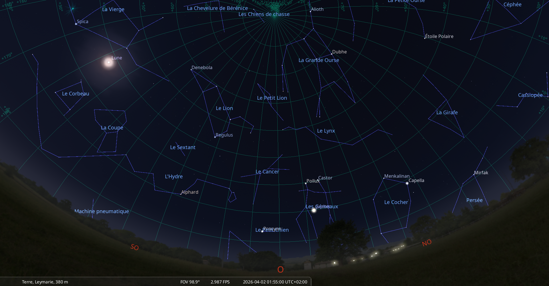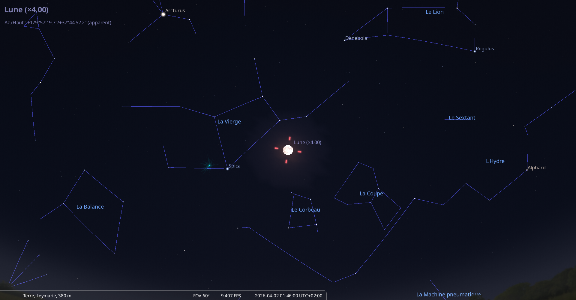 Elle culmine le 2 avril à 1h46, à 37° de hauteur, soit 17° plus bas que la Pleine Lune précédente, le 3 mars.
