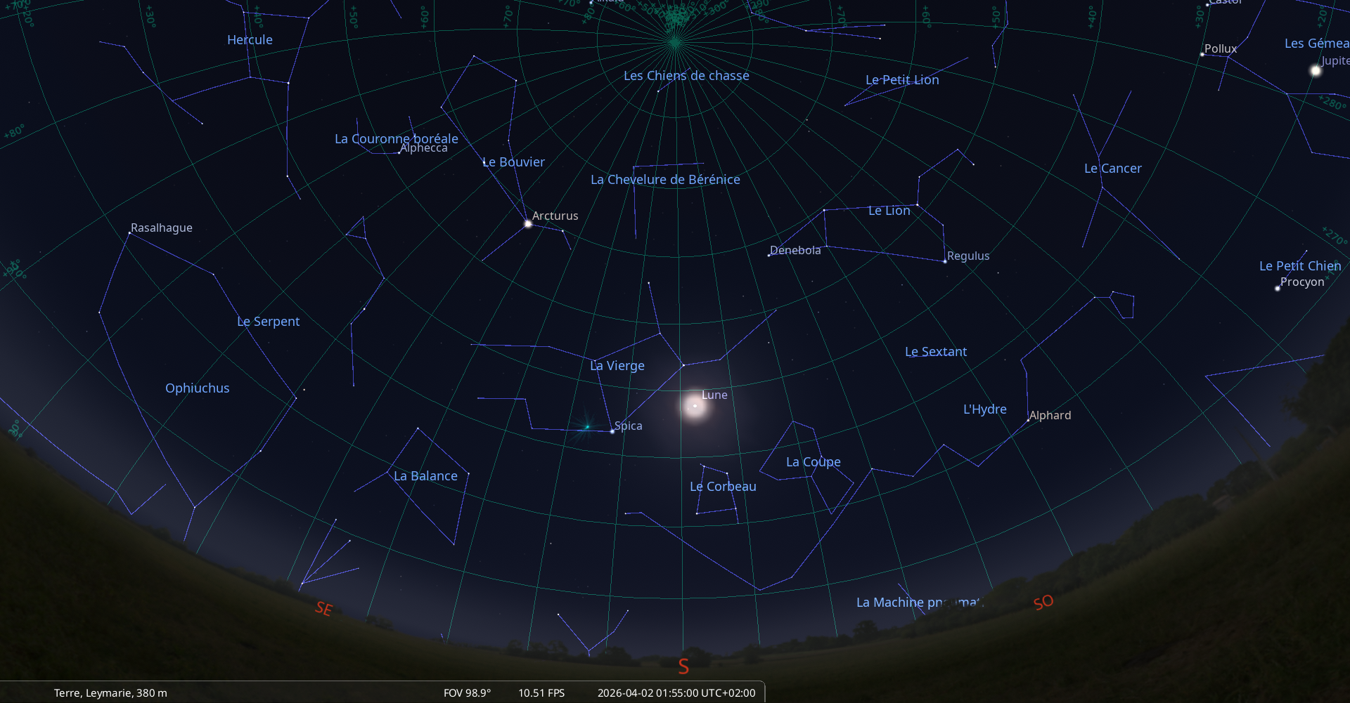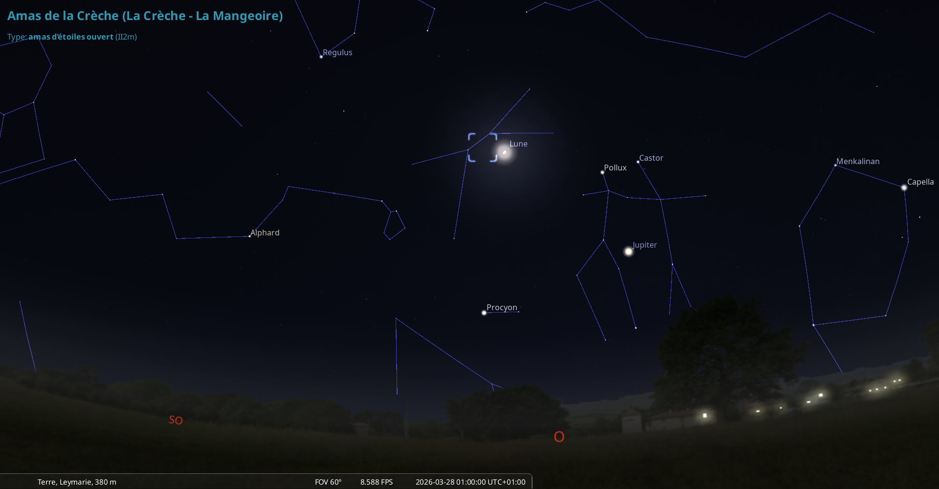 La nuit du 27 au 28 mars, pour notre localisation, la Lune culmine à 20h56, la Crèche à 21h12 ;