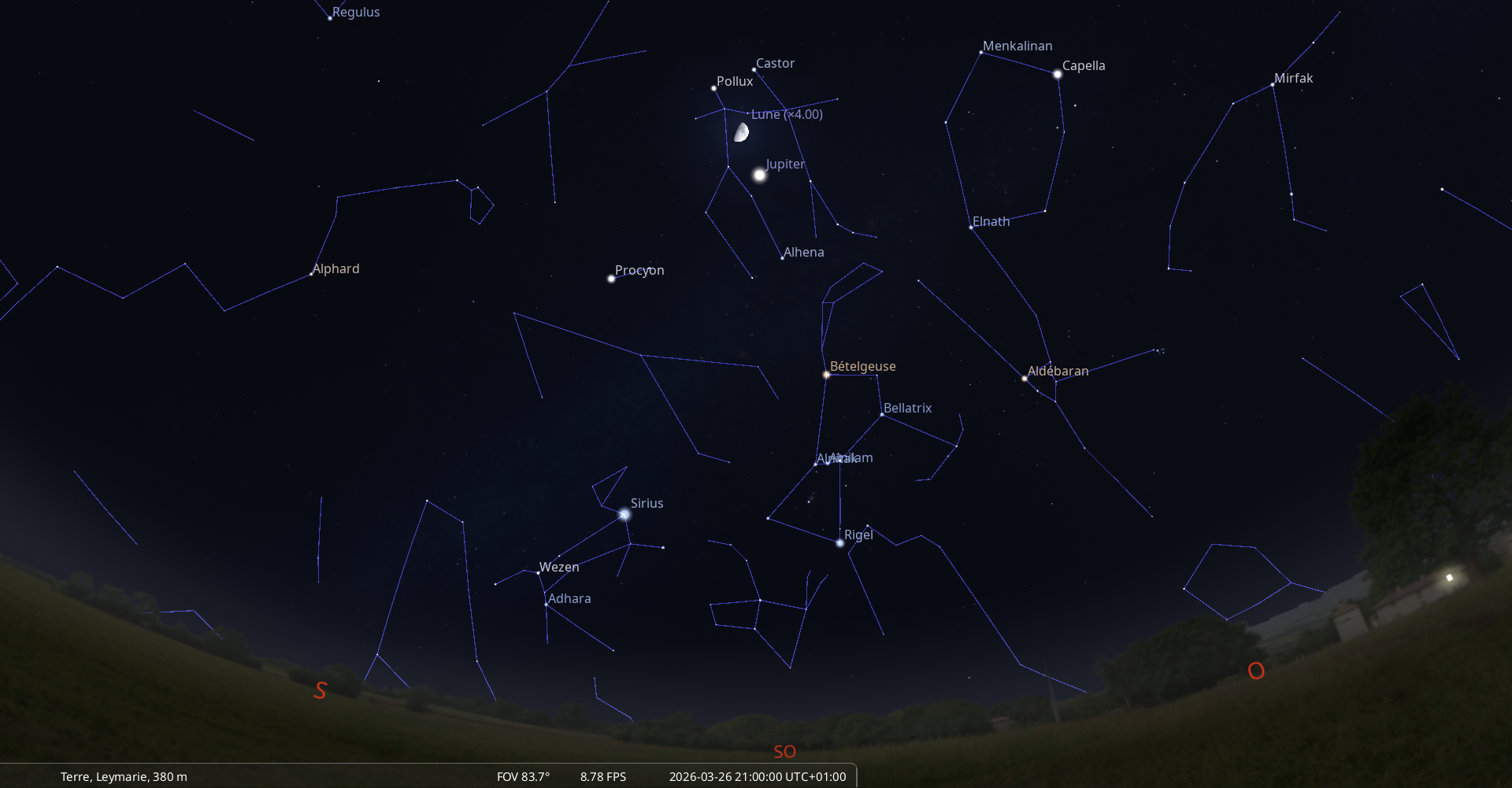 La nuit du 26 au 27 mars, pour notre localisation, la Lune culmine à 19h59, Pollux à 20h21 ;