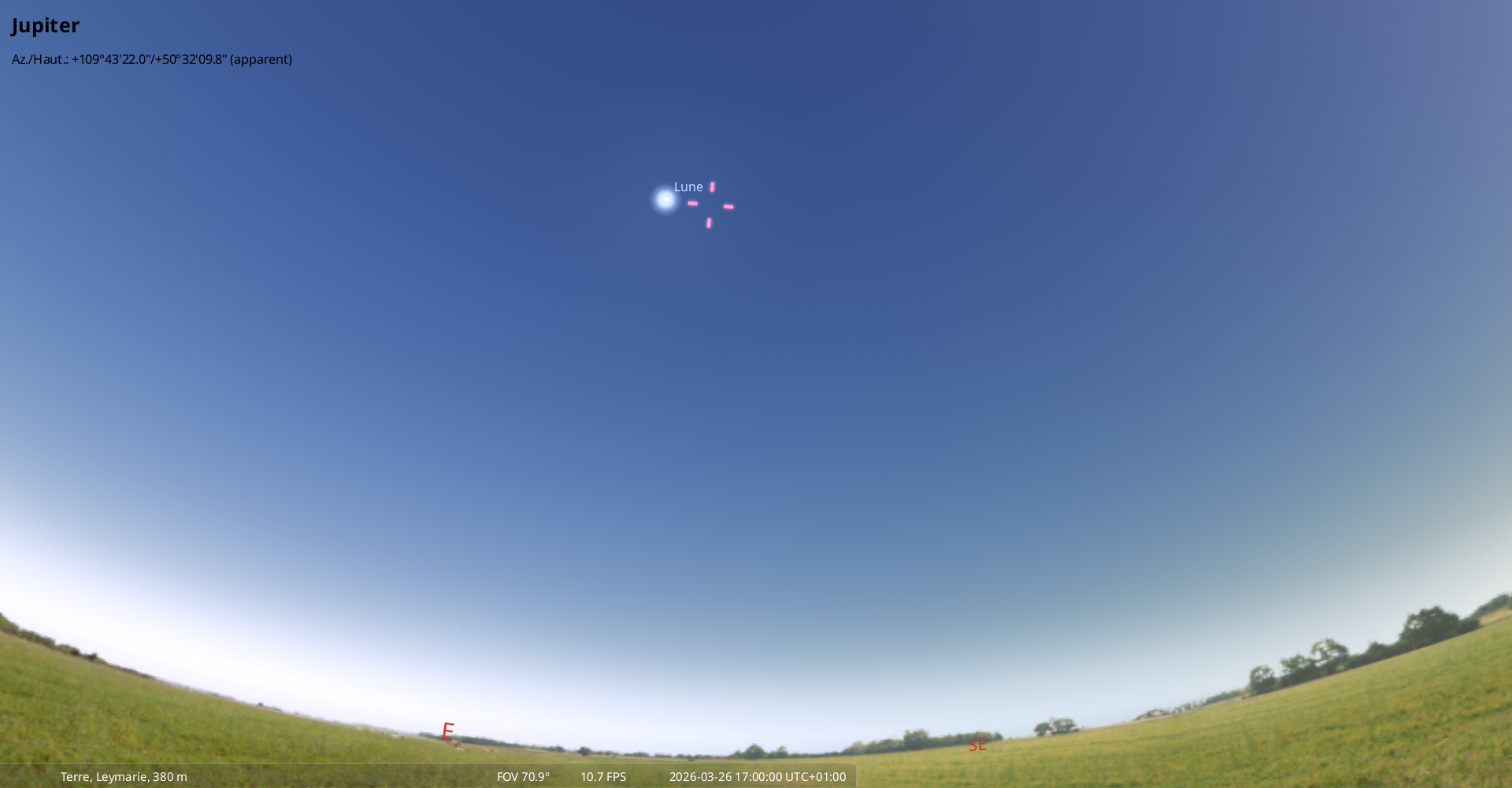 La nuit du 26 au 27 mars, pour notre localisation, Jupiter culmine à 19h42, la Lune à 19h59 ;