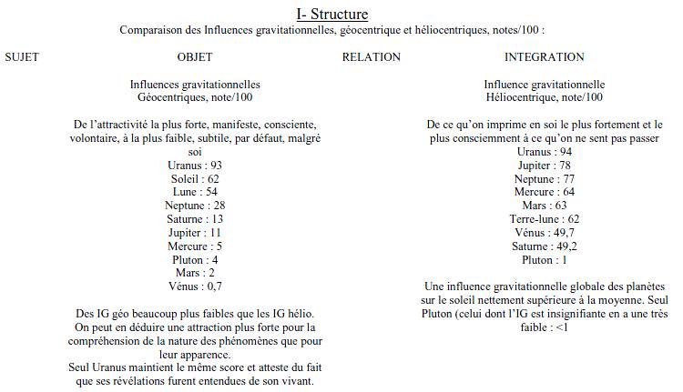 – Les influences gravitationnelles relatives en Intégration sont toutes presque égales ou supérieures à la moyenne, seul Pluton affiche un petit « 1 » : ce pourrait-il que ce cas de figure signale une compréhension particulièrement lucide des rouages de la vie, mais à laquelle échappe l’essentiel Pluton, comme lui a échappé le secret de la bombe atomique, résultant malgré lui de ses travaux.