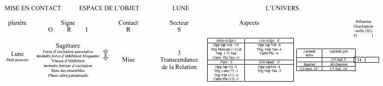 fonction d’homogénéité, de cohérence, la Lune est appréhendée comme objet dans l’environnement (mise en contact) ; c’est ce avec quoi il va falloir faire (plein contact) en fonction de ses aspirations (pré contact). C’est le monde, l’univers.