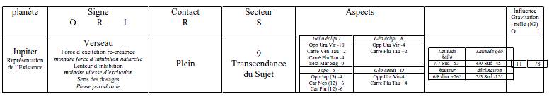 – L’opposition appliquante de Jupiter Verseau, secteur 9 de la sphère locale, est un aspect invariant dans les 4 référentiels. Elle est au carré en T de Pluton Taureau, sauf en sphère géo équatoriale (référentiel Objet) où le carré d’Uranus à Pluton, séparant de 8° en signes en trigone n’est plus.
