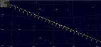 – Elle est en déclinaison Nord du 2 avril au 25 août. Elle sortira des limites zodiacales du 3 au 17 mai, atteignant un maximum Nord le 11 mai, puis redescendra jusqu’à un palier le 13 juin ; ensuite elle remontera, sans sortir des limites zodiacales, jusqu’à un nouveau maximum le 14 juillet.