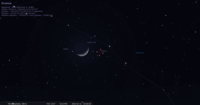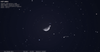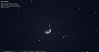 – Aux alentours de 1h (0h UTC), le croissant primeur de cette lunaison est théoriquement observable avec un instrument juste après le coucher du Soleil, 10 heures environ après la Nouvelle Lune, pour le lieu situé par 28° Nord et 172° Ouest (Nord Pacifique). Voir les très fins croissants de Lune