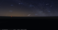 – A 3h56, plus petit écart angulaire entre Mercure et Vénus : 4°0’. Les deux planètes sont visibles à l’aube vers 7h, juste au-dessus de l’horizon Est-Sud-Est.