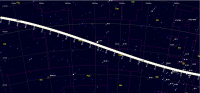 – Sur l’image ci-contre, la position du Soleil devant les constellations à notre époque, jour après jour du 16 décembre à 12h UTC (25e SAG) au 14 avril (25e BEL) (les planètes sont positionnées pour le 12 décembre). Rappelons que la précession des équinoxes décale sa position devant les étoiles d’un degré tous les 70 ans