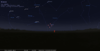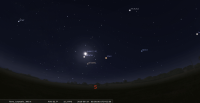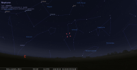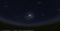 - A 12h23, la Lune est conjointe à Mars dans le plan équatorial, la planète 7°6’ au Sud ; élongation solaire de la Lune 145° Est.