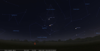 - A 20h04, premier croissant de cette lunaison, visible à l’œil nu, 41 heures et 52 minutes après la Nouvelle Lune ; de 2,9%, devant la Vierge (Vir), à 3° de hauteur au-dessus de l’horizon, azimut 255°, 37 minutes après le coucher du Soleil, celui-ci étant alors à 7° sous l’horizon ; ce premier croissant de Lune se couche à 20h25 pour notre localisation, à l’azimut 258° ; longitude écliptique 29e BAL.