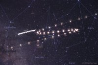 – Sur l’image ci-contre, la position du Soleil devant les constellations à notre époque, jour après jour du 20 août à 14h (28e LIO) au 19 janvier (30e CAP) (les planètes sont positionnées au 20 août ). Rappelons que la précession des équinoxes décale sa position devant les étoiles d’un degré tous les 70 ans.