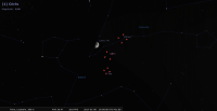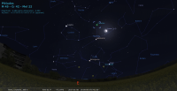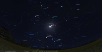 - A 19h57, la Lune est conjointe aux Pléiades (M45) dans le plan équatorial, l’amas ouvert 9°25’ au Nord. Au début de la nuit, l’amas, très discret, est au-dessus de la Lune à une quarantaine de degrés de hauteur à l’Est ; ils culminent aux alentours de 21h30, et se couchent aux alentours de 4h30.