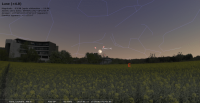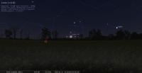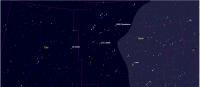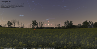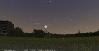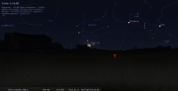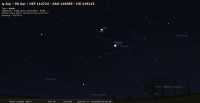 - A 3h07, la Lune est conjointe à Uranus dans le plan équatorial, la planète 3°16’ au Nord ; élongation solaire de la Lune 93° Est. Ce soir, repérer la position d’Uranus par rapport à la Lune ou la chercher avec un instrument. Plus difficile, repérer Cérès et , impossible, l’invisible Eris.