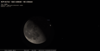 - A 2h38 (pour notre localisation), l’étoile HD 150 416 d’Ophiuchus (Oph), magnitude 4.9, réapparaît après son occultation par la Lune, du côté sombre du disque lunaire puisque nous sommes en Lune décroissante ; les deux astres, sur leur levant, sont à 12° de hauteur environ, la portion éclairée de la Lune étant de 65%.