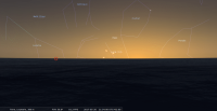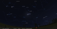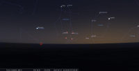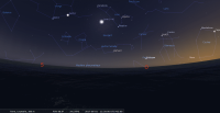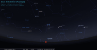 - Aux alentours de 22h15, apprécier le premier croissant de cette lunaison certainement visible à l’œil nu ; de 6,3%, âgé de 48,5 heures, devant Orion (Ori), il accompagne Mars. Il se trouve à 12° de hauteur au-dessus de l’horizon, azimut 284°, une heure environ après le coucher du Soleil, celui-ci étant alors à 8° sous l’horizon. La Lune se couche à 23h13 pour notre localisation, à l’azimut 297° ; longitude écliptique 6e CAN.