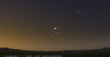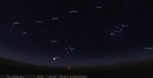 – A 21h40, la Lune est conjointe aux Pléiades (M45) dans le plan équatorial, l’amas ouvert 9°24’ au Nord. Délicat spectacle à saisir le 22 à l’aube avec le dernier croissant : les Pléiades se lèvent peu avant 4h, la Lune, près d’une heure plus tard.