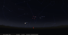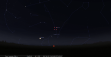 – A 21h53, la Lune est conjointe à Mars dans le plan équatorial, la planète 4°24’ au Nord ; élongation solaire de Mars 10° Est. Invisible.