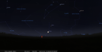 – A 7h34, dernier croissant de Lune théoriquement facilement visible à l’oeil nu : de 2,70%, 37 heures et 38 minutes avant la Nouvelle Lune, à 10° de hauteur et 100° d’azimut pour notre localisation, le Soleil étant à 7° sous l’horizon ; il se lève 1 heure 42 minutes avant le Soleil, à 6h29, à l’ azimut 89° pour notre localisation ; longitude 7e BAL ; en compagnie de Vénus.