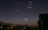 – A 13h27, elle est conjointe à Regulus dans le plan écliptique, ∆ +0°12’ ; longitude (moyenne de la date) 150°4’46" - Régulus marque de nos jours, l’entrée dans le signe de la Vierge. Aujourd’hui, elle se lève aux environs de 3h35, 25 minutes après la Lune.