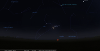- A 12h00, la Lune est conjointe à Alhena (gamma des Gémeaux ; m 1.9) dans le plan équatorial, l’étoile 3°38’ au Sud. Ce soir, les deux astres se lèvent au Nord-est aux alentours de 19h30 ; ils culminent aux alentours de 2h30 à 60° de hauteur environ.