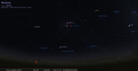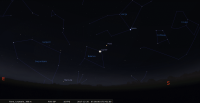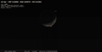 - A 17h55, premier croissant de cette lunaison théoriquement facilement visible à l’œil nu : de 1,88%, âgé de 34 heures et 25 minutes, devant le Sagittaire (Sgr), il se trouve à 4° de hauteur au-dessus de l’horizon, azimut 234°, 44 minutes après le coucher du Soleil, celui-ci étant alors à 7° sous l’horizon. La Lune se couche à 18h29 pour notre localisation, soit 1 heure 18 minutes après le Soleil, à l’azimut 240° ; longitude écliptique 13e CAP.
