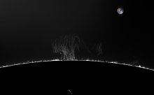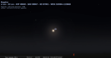 – A 20h21, elle est conjointe à Regulus dans le plan écliptique, ∆ +0°55’ ; longitude (moyenne de la date) 150°5’0". - Régulus marque de nos jours, l’entrée dans le signe de la Vierge. Les deux astres se lèvent aux alentours de 19h20 ; à l’heure de la conjonction, ils sont à l’Est, à une dizaine de degrés de hauteur. Ils culminent aux alentours de 2h.