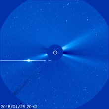 - Dans le champ du coronographe Lasco C3 [3] : la planète Vénus du 5 décembre au 13 février ; la planète Mercure du 6 au 26 février (elle y croisera Neptune le 25 février) ; l’étoile Deneb Algedi (delta du Capricorne) du 6 au 20 février.