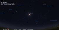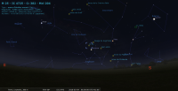 Le 1er mars au soir, illuminée à 99,8%, elle est déjà postée à l’horizon Est quand le Soleil disparaît. Elle se trouve entre les pattes du Lion et culmine à 55° de hauteur. Elle se couche juste après le lever du Soleil.