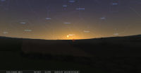 - A 7h56, la Lune est conjointe à Jupiter dans le plan équatorial, la planète 3°57’ au Sud ; élongation solaire de Jupiter 113° Ouest. Bien remarquable en fin de nuit : la Lune se lève aux environs de 0h suivie par Jupiter une demi-heure plus tard ; les deux astres culminent aux alentours de 5h.
