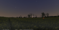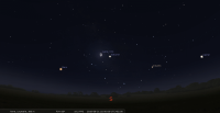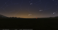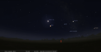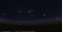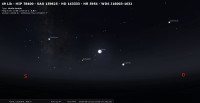 - Le 26 au soir, il faut attendre une vingtaine de minutes après le départ du Soleil avant de la voir apparaître à l’Est-sud-est à la gauche de Mars ; au lever du jour, elle est encore à 5° au-dessus de l’horizon Ouest-sud-ouest..