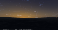 – A 8h36, la Lune est conjointe à Jupiter dans le plan équatorial, la planète 3°7’ au Sud ; élongation solaire de la Lune 30° Ouest. La Lune se lève peu avant 6h, suivie par Jupiter un quart d’heure plus tard.