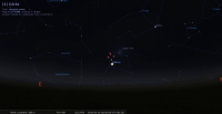 - A 18h40, la Lune est conjointe à Mercure dans le plan équatorial, la planète 2°45’ au Sud ; élongation solaire de la Lune 14° Ouest. La Lune se lève peu avant 7h, suivie par Mercure une demi-heure plus tard.