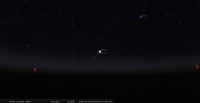 - A 2h35, la Lune est conjointe à Antarès dans le plan équatorial, l’étoile 8°36’ au Sud. La Lune se lève aux alentours de 6h55 pour notre localisation, suivie par Antarès, une demi-heure plus tard.
