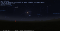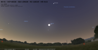 - A 7h14 (pour notre localisation), la Lune occulte l’étoile 80 Vir (Vierge, magnitude 5.7). Les deux astres sont alors sur le couchant, à 27° de hauteur quand l’étoile disparaît derrière la Lune, dont la portion éclairée est de 82%. Nous ne pouvons assister à la réapparition de l’étoile car elle a lieu dans le jour, après leur coucher.