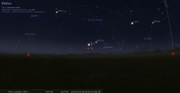 - A 2h04, la Lune est conjointe à Spica dans le plan équatorial, l’étoile (alpha Virgo) 7°46’ au Sud. La Lune se lève aux alentours de 22h10 pour notre localisation, suivie par l’étoile quarante minutes plus tard ; les deux astres culminent aux alentours de 4h (hauteur Spica 35° environ).