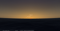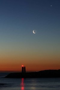 - Aux alentours de 19h17, soit 26 heures et 13 minutes après le coucher du Soleil, premier croissant de cette lunaison théoriquement visible seulement à l’aide d’un instrument mais pouvant être tenté à l’œil nu : de 1,3%, il se trouve à 2° de hauteur au-dessus de l’horizon, azimut 260°, 33 minutes seulement après le coucher du Soleil, celui-ci étant alors à 6° sous l’horizon. Devant les Poissons (Psc), 29e POI, il accompagne Mercure. La Lune se couche à 19h34 pour notre localisation, soit 50 minutes après le Soleil ; longitude écliptique .