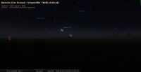 - A 23h03, la Lune est conjointe à Antarès dans le plan équatorial, l’étoile 8°15’ au Sud. La Lune se lève aux alentours de 0h30 pour notre localisation, suivie par Antarès une demi-heure plus tard. Les deux astres culminent peu après 5h.