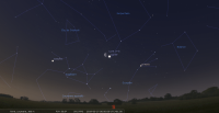 - A 3h27, la Lune est conjointe à Jupiter dans le plan équatorial, la planète 1°54’ au Sud ; élongation solaire de Jupiter 102° Ouest. Les deux astres se lèvent peu avant 2h et culminent aux alentours de 6h.