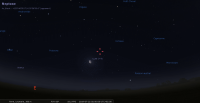 - A 1h24, la Lune est conjointe à l’étoile Nunki (sigma Sagittaire ; m 2.05) dans le plan écliptique, l’étoile 3°53’ au Sud. En raison de la précession des équinoxes, Nunki marque de nos jours le 13e degré du signe du Capricorne (longitude 282°39’45"). La conjonction dans le plan équatorial a lieu à 2h07, Δ+3°53’. Au cours de cette nuit pour notre localisation, les deux astres culminent peu avant 1h30 (à l’heure de la conjonction), en compagnie de Saturne.