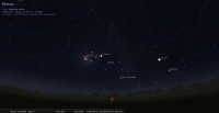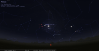 – A 19h17, la Lune est conjointe à Pluton dans le plan équatorial, Δ +0°2’ ; élongation solaire de Pluton 178° Est. Au cours de la nuit qui vient, Saturne et la Pleine Lune -qui passe dans l’ombre de la Terre- permettent de localiser Pluton.
