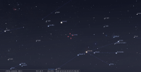 - A 19h46, la Lune est conjointe à l’étoile Nunki (sigma Sagittaire ; m 2.05) dans le plan écliptique, l’étoile 3°30’ au Sud. En raison de la précession des équinoxes, Nunki marque de nos jours le 13e degré du signe du Capricorne (longitude 282°39’58"). La conjonction dans le plan équatorial a lieu à 20h25, Δ+3°29’. Pour notre localisation, Nunki culmine au coucher du Soleil avec la Lune et Saturne et se couche aux alentours de 0h00.