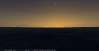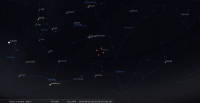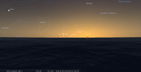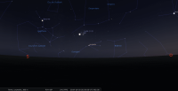 - Aux alentours de 20h10, soit 35 minutes après le coucher du Soleil, premier croissant de cette lunaison. Âgé de 23 heures et 40 minutes après la Nouvelle Lune, un instrument peut être nécessaire pour le distinguer : de 1,7%, il se trouve à 2° de hauteur, azimut 262°, le Soleil étant alors à 6° sous l’horizon. Devant la Vierge (Vir) ; longitude écliptique 20e BAL, il se couche à 20h25 pour notre localisation, azimut 264°.