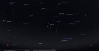 - A 5h18, la Lune est conjointe à Antarès dans le plan équatorial, l’étoile (alpha du Scorpion, m 1.1) 7°24’ au Sud. A remarquer hier soir et ce soir, en compagnie de Jupiter. Antarès se couche aux alentours de 21h40 pour notre localisation ; la Lune lui succède, une vingtaine de minutes plus tard le 2, et une bonne heure plus tard le 3.