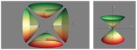 Fig. 2 (à droite) : Le cône de lumière classique connu (futur et passé) de la relativité classique dans un diagramme espace-temps est un cas particulier de la Fig. 1.